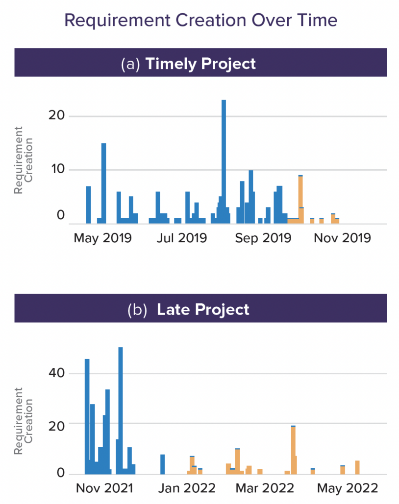 For the purpose of this analysis, we define “late requirements” as those requirements created after the completion of a project’s requirement decomposition phase which we estimate as spanning the middle 50% of all requirement creation activity (creation and refinement). To illustrate what late requirements look like, we show two actual projects below with requirement activity plotted over time.