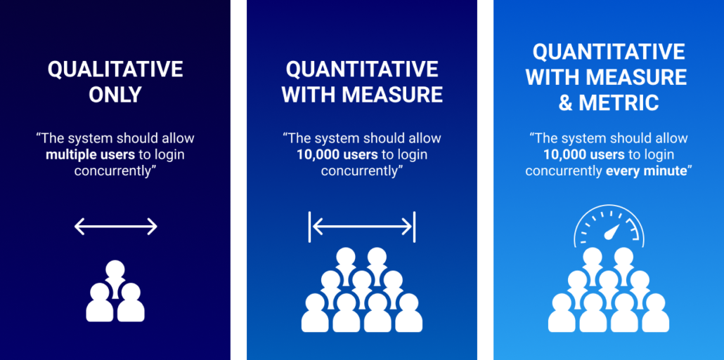 Non-functional requirements help companies measure the success of a system, so they must be measurable. The metrics must be qualitative and quantitative. You might require, for example, that a system be able to handle expansion in the future. That’s a qualitative goal, but let’s take it a step further and make it quantitative as well. You might require that the system handle at least 30,000 users within the next three years.