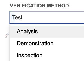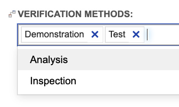 The concept described above for disciplines also applies to verification methods. The out-of-the box configuration of system and subsystem requirements provides a multi-select field for defining the verification method for the requirement: