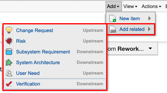 To encourage trace as a way of working, you have to make it easy to connect to new or existing information. You can create new information, both upstream and downstream, directly from related items In Jama Connect. This allows for authoring of new information and the automatic tracing of items.