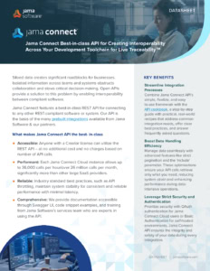 Jama Connect’s best-in-class API is available at no additional cost. Benefit in many ways including reporting, data & trace synchronization, and test results import. Combine Jama Connect API’s simple, flexible, and easy to use framework with resources for step-by-step guidance and practical, real-world recipes that address common integration needs, offer clear best practices, and answer frequently asked questions.