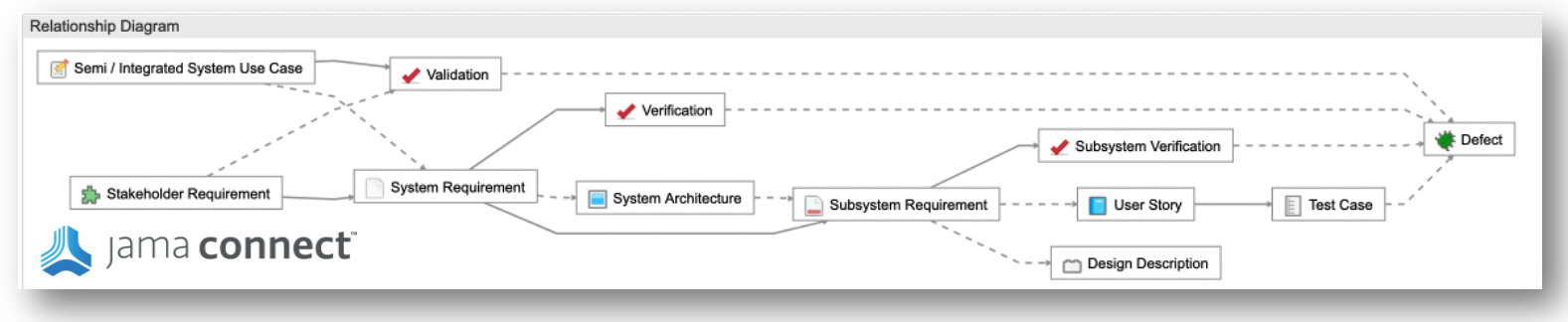 Live Traceability requires a model of the key process elements and their relationship rules to monitor during the development process. The systems engineering V Model is a useful framework to start with for data object and relationship definition. Jama Connect® uniquely provides a point and click, configurable, relationship rule capability to enable Live Traceability. Below you see a sample relationship rule diagram from Jama Connect. Relationship rules vary by industry and company-specific requirements. Best practice templates are provided to comply with industry standards and configured to meet client-specific needs. The definition of a traceability model forms the foundation for model-based systems engineering since it defines model elements and their relationship to each other in a consistent manner across the entire system architecture.