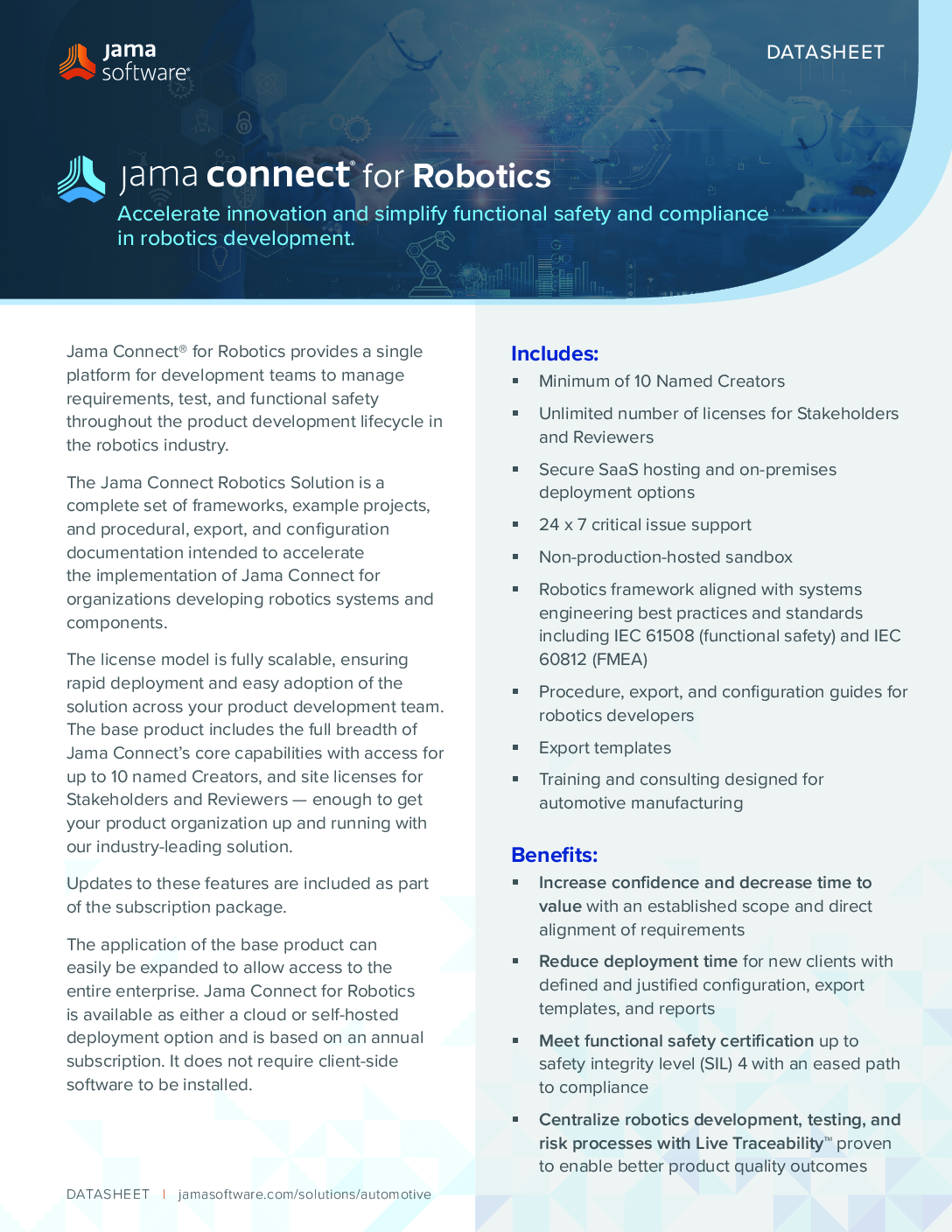 Download our datasheet to learn more about how robotics teams can accelerate innovation and simplify functional safety compliance using Jama Connect for Robotics, which includes: