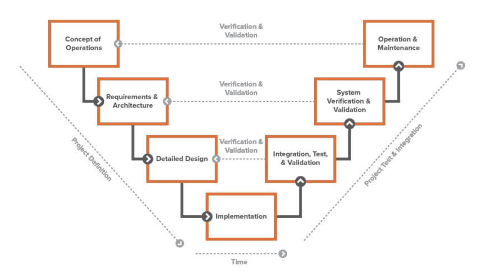 The “V” diagram allows system engineers multiple viewpoints and opportunities to evaluate systems as they integrate with each other. This approach starts with the desired outcomes and objectives and then deconstructs them into individual systems and system components for the purpose of design. Once the requirements and design details are established, individual systems can be tested and evaluated, then integrated into the overall piece for testing and verification. As the systems are integrated and become closer to the final complex system, teams have multiple opportunities to validate and verify concepts, requirements, and design.